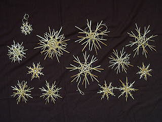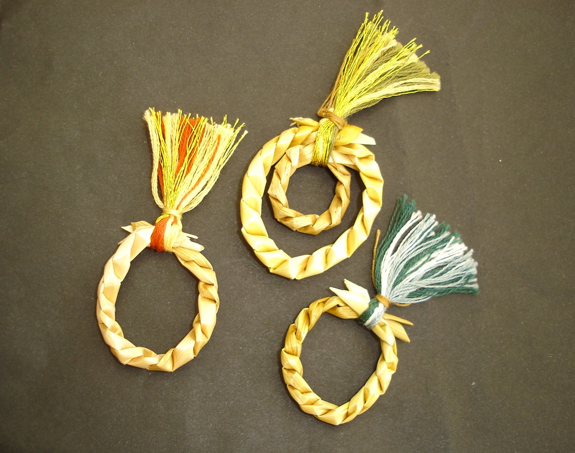 主な作品 麦わらならではの色、風合い、手触りを楽しんで ・昔の虫かご 日本民藝館において展示保存されている約100年前に東北地方で作られた「虫かご」を観察し、試作を重ねて再現しました ・華結晶 切り込みを入れた型を使うと、麦わらで雪の結晶のような美しい作品が作れます。会では「華結晶」と名づけています ・かわいい動物たち 馬 キリン 猫(大田区立郷土博物館麦の会作) ・かごもの 花入れ 小物入れ 虫かごなど ・小物もいろいろ お守り キーホルダー 万華鏡 ・黄金色のアクセサリー ペンダント イヤリング ブローチ ・自然素材の持ち味を生かしたオブジェ オブジェ オブジェ オブジェ